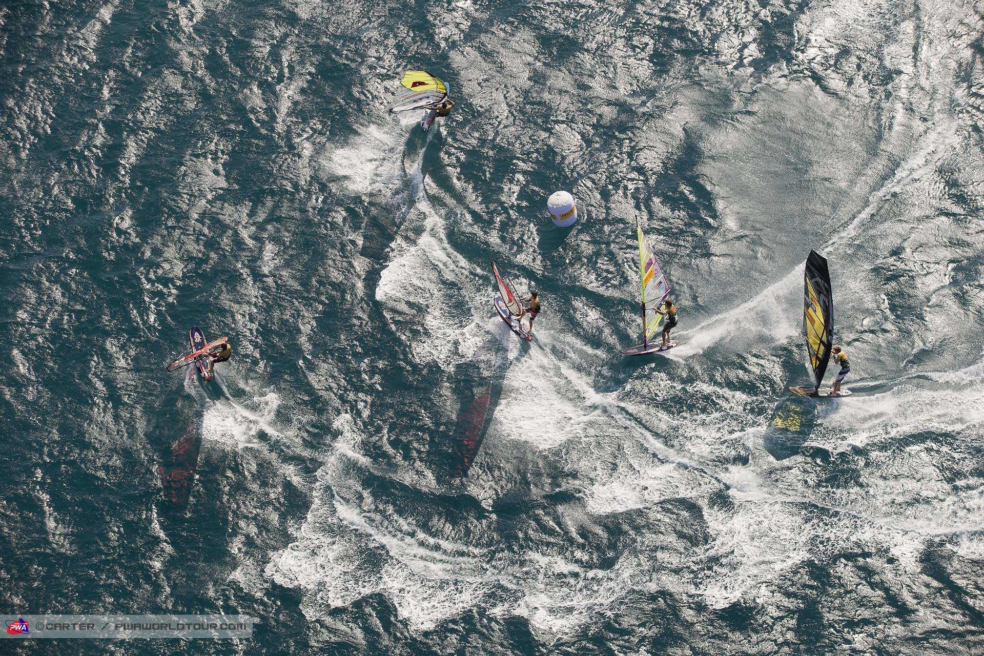 Die erste Hälfte des Tages erwies sich zunächst noch als äußerst frustrierend. Ständig änderte der Wind die Richtung, wie auch seine Stärke. Erst am späten Nachmittag stabilisierte sich der Wind langsam und blies mit 15-28 Knoten. Jeweils zwei Eliminations wurden gefahren, die erste gewann Antoine Albeau (RRD / NeilPryde), Julien Quentel (RRD / NeilPryde) gewann Nummer zwei. Delphine Cousin (Starboard / Loft Sails) war die erste Frau in dieser Woche der es gelang Sarah-Quita Offringa (Starboard / Mystic) zu besiegen, allerdings war Offringa in der sechsten Elimination erneut wieder auf der Siegerstraße zurück.