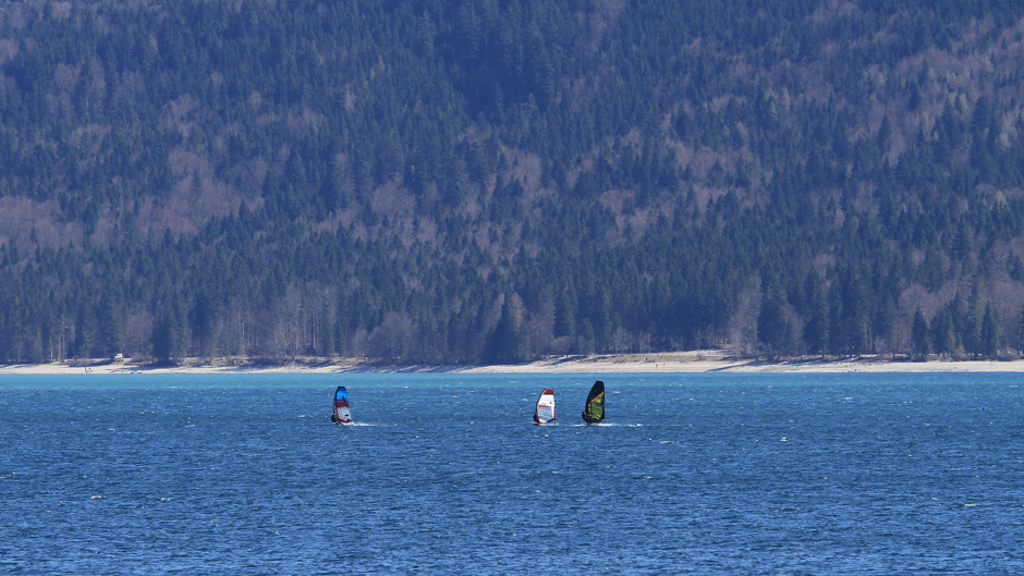 Der Kochelsee lieferte am 25. und 27. 4 noch etwas Föhnwind. Rainer Motloch wurde schon kurz nach dem Start von einem größeren Holzstück im Wasser abrupt ausgebremst und beendete seine Session mit beschädigtem Board vorzeitig. Ergebnis der superkurzen Session - Platz 6 mit einem Durchschnittsspeed von 30,015 Knoten.