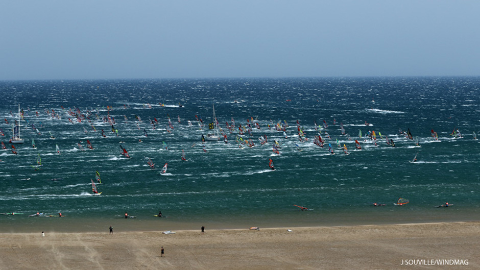 Der Tramontana traf pünktlich für den ersten Tag des 15. Défi Wind in Gruissan ein. Allerdings hat wohl kaum einer während des morgendlichen Briefings von Philippe Bru, dem Rennleiter, damit gerechnet, dass der Wind während des Rennens mit über 50 Knoten bläst. Die 1200 Starter wurden deshalb schon auf der ersten 40km Runde des Defi Wind 2015 kalt erwischt. Am besten schlug sich Pierre Mortefon im Kampf gegen den tobenden Tram. Er gewann vor Nicolas Warembourg und Diony Guadagnino. Von den 1200 Startern haben nur 377 dieses erste Rennen beendet.