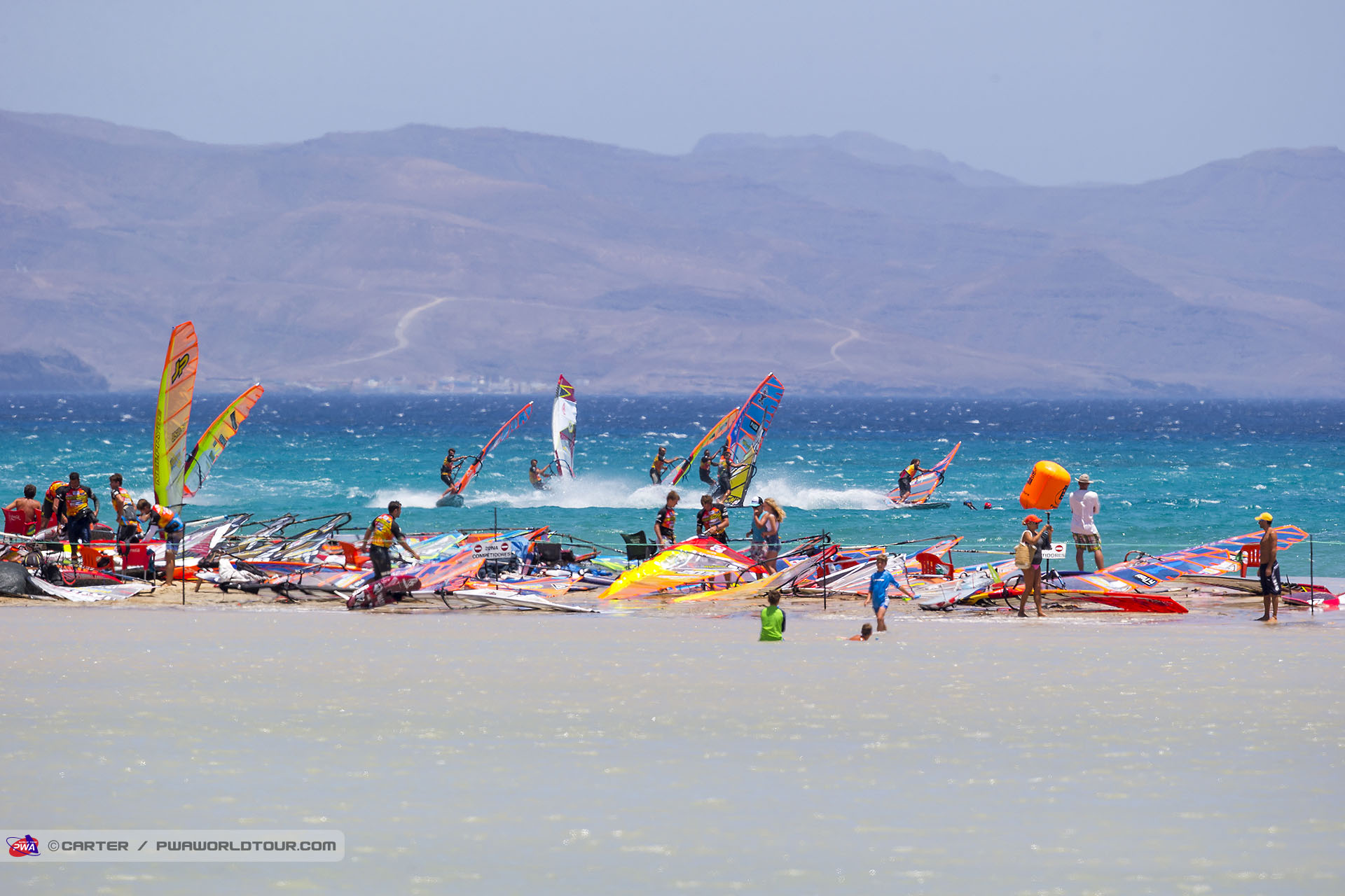 Auch am siebten Tag des Fuerteventura PWA Grand Slam und dem zweiten Tag der Slalomrennen funktioniert die Windmaschine in Sotavento wie ein Uhrwerk. Auch am heutigen Tag konnten drei Eliminations abgeschlossen werden. Das Niveau der Racer ist extrem hoch, in den drei Rennen des Tages gab es erneut drei verschiedene Sieger. Pierre Mortefon (Fanatic / North) gewann die erste Elimination des Tages bevor ihm Ben van der Steen (Tabou / GA Segel / Mystic) in Elimination fünf die Show stahl. Im sechsten Rennen war es Taty Frans (Starboard / GA Segel / Mystic) der sich mit herausragender Performance im letzten Rennen des Tages behauptete und seine erste Elimination überhaupt gewann.