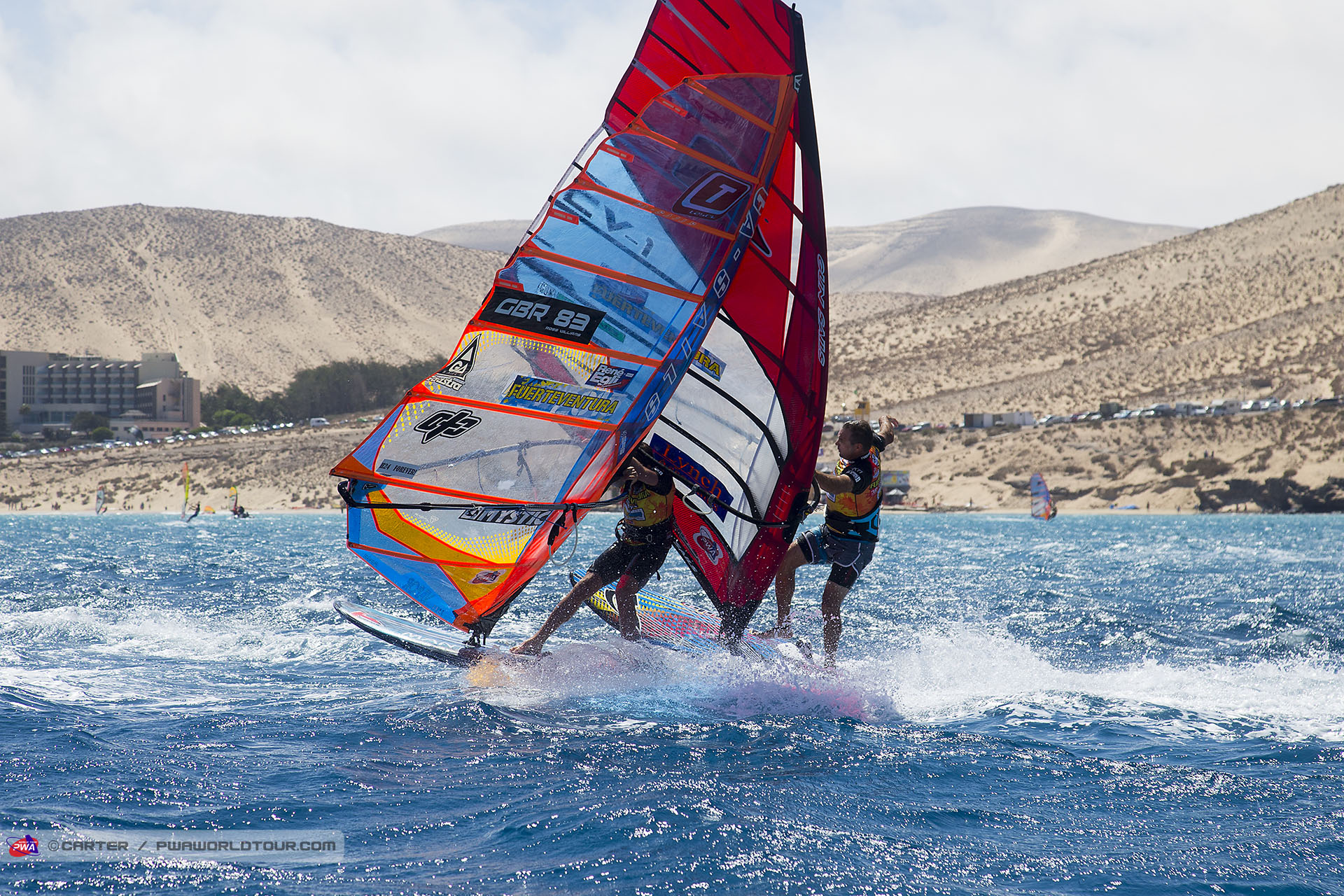 Der Tag begann mit starker Bewölkung, nicht gerade die besten Voraussetzungen für starken Wind im Süden Fuerteventuras. Kurz nach Mittag legte der Wind doch noch zu, allerdings nicht mehr so stark wie an den beiden Vortagen. Bei 10- 20 Knoten Wind, die Racer waren mit 8.5er und 7.8er Segeln auf dem Wasser, wurde die siebte Elimination gestartet. Bevor jedoch die beiden Finals gefahren werden konnten, schlief der Wind ein.