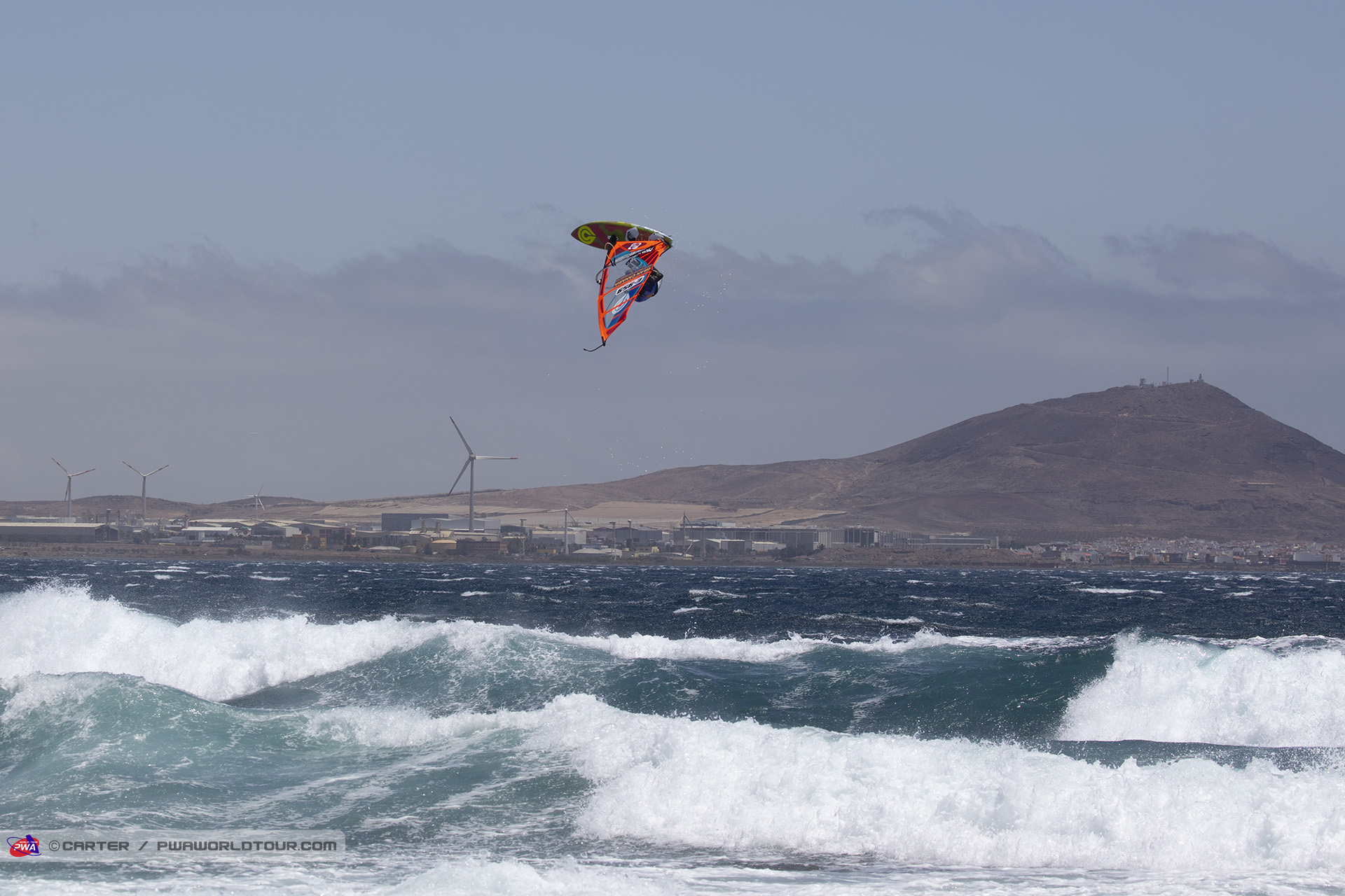 Women’s / Single EliminationThe top seeds in the women’s draw survived the first day of competition unscathed to safely progress into the top 8. Vice-world champion - Sarah-Quita Offringa (Starboard / NeilPryde / Maui Ultra Fins) - made an assured start to her campaign as she posted the second highest score of the day - 23.86 points - to dispatch of Julia Pasquale (Fanatic / Duotone), who won the U17s yesterday. Pasquale was a little unfortunate to be drawn against Offringa as she would’ve progressed from the a-side on the panel, which saw Marine Hunter (KA Sail) defeat Serena Zoia (Fanatic / Duotone).Defending event champion - Daida Moreno (Severne / Severne Sails / Maui Ultra Fins) - set the highest scoring heat of the day - 26.75 points - as she landed a trademark stalled forward, big backloop and earned a 7.25 point wave to make a confident start. On the other side of Heat 10 Birgit Rieger (Flikka) claimed an impressive victory against Nicole Bandini (Fanatic / Duotone) with the Austrian landing a backloop.In Heat 11 - Maaike Huvermann (Starboard / Severne / Maui Ultra Fins) - saw off the challenge of Nuage Le Derff (Severne / Severne Sails) on the a-side, while Justyna Sniady (Simmer / Simmer Sails / AL360) navigated her way past Alexia Kiefer Quintana (Fanatic / Duotone) with an efficient display.Reigning world champion - Iballa Moreno (Severne / Severne Sails / Maui Ultra Fins) - sailed in the final women’s heat of the day and she made light work of Svetlana Kolpikova Bala to set up a quarterfinal tie against Caterina Stenta (RRD / RRD Sails / AL360 / Maui Ultra Fins) after the Italian survived a late comeback by Oda Brødholt (Starboard / Severne/ Maui Ultra Fins).Men’sDuring the morning and early afternoon the men’s fleet was reduced to just the top 16 sailors, but with the tide becoming too high and conditions deteriorating the contest was then placed on hold. However, after an hour the competition resumed with the wind cranking up an extra notch and the ramps improving with the tide dropping back, which allowed the round of 16 to be completed after 4pm in over 35-40 knots of wind.The restart - Heat 17 - saw the vice-world champion - Ricardo Campello (Brunotti Boards) - in action against Marc Paré (Simmer / Simmer Sails) for a place in the top 8. The Brazilian/Venezuelan needed to at the top of his game, with Paré producing an excellent display, which included a sick stalled double forward - 9.1 points - and luckily he was as he posted the second highest score of the day - 33.88 points. With the wind picking up from earlier Campello was able to land a trademark pushloop forward and double forward, while recording wave scores or 8.65 and 7.5 points. On the a-side, Alex Mussolini (RRD / RRD Sails) manoeuvred his way past Robby Swift (JP / NeilPryde / SWOX) with the Brit missing his second jump score.Reigning world champion - Victor Fernandez (Fanatic / Duotone / Shamal Sunglasses) - earned the only 10 point wave ride of the day against Omar Sanchez (Star-Fish / KA Sail) on the way to posting the fourth highest score of the day - 30.83 points to book his place in the quarterfinals. The Spaniard will now face Leon Jamaer (JP / NeilPryde) after the German came out on top of an extremely close heat against Adam Lewis (Fanatic / Duotone / SWOX). In the end, there was just 0.17 of a point between them.Jose ‘Gollito’ Estredo (Fanatic / Duotone), who finished joint 7th here in 2018, claimed the scalp of world No.4 Jaeger Stone (Starboard / Severne / SWOX / Shamal Sunglasses) in Heat 19a as the 9-time Freestyle world champion continues to evolve his wave sailing skills. In the previous round, it was Gollito’s jumping that helped him past Marino Gil (Goya Windsurfing), but against Stone, it was his wave riding that proved to be the difference as he posted an almost perfect 9.68 point wave after combining a goiter and a frontside 360 on the same wave. Stone actually outscored Gollito in the air, but for a change, the Aussie struggled to find wave scores in the tricky conditions, which is usually his forte.On the b-side, last year’s runner up - Marcilio Browne (Goya Windsurfing) - recorded the third highest score of the day, just behind Campello, on 33.63 points. The Brazilian posted two excellent jump scores - 9 and 9.45 points - for a massive double forward and pushloop forward, while also recording one wave in the excellent range as he showed why he is one of the favourites for the event. Browne will now go head-to-head against Gollito for a place in the semifinals.Alessio Stillrich (Fanatic / Duotone), who missed the entirety of last season through injury made a winning return against Antony Ruenes (Tabou / GA Sails), but then suffered a narrow defeat to Thomas Traversa (Tabou / GA Sails), who was absolutely delighted to progress. Advancing Into the top 8 guarantees TT a better result here than last year when he had to settle for 17th place. Traversa will no face hat-trick seeking Philip Köster (Starboard / Severne / Maui Ultra Fins), who posted the highest score of the day in the round of 32 with 35.38 points after landing a backloop off the lip, an air taka and a bolt upright pushloop forward despite the less than perfect conditions.By the end of the day all four of last year’s top 4 - Köster, Browne, Campello, Fernandez - are safely into the quarterfinals, while between them, they ominously hold the top 4 highest scores of the day:1st Philip Köster - 35.38 points 2nd Ricardo Campello - 33.88 points 3rd Marcilio Browne - 33.63 points 4th Victor Fernandez - 30.83 pointsElsewhere, Moritz Mauch (Severne / Severne Sails) showed once again that he is one of the best onshore wave riders in the world, however, his suspect jumping cost him again against Robby Swift in the second round. Josep Pons (I-99 / Point-7) sailed through the pain barrier to advance into the third round before deciding not to sail against Köster in order to save himself for the double eliminat