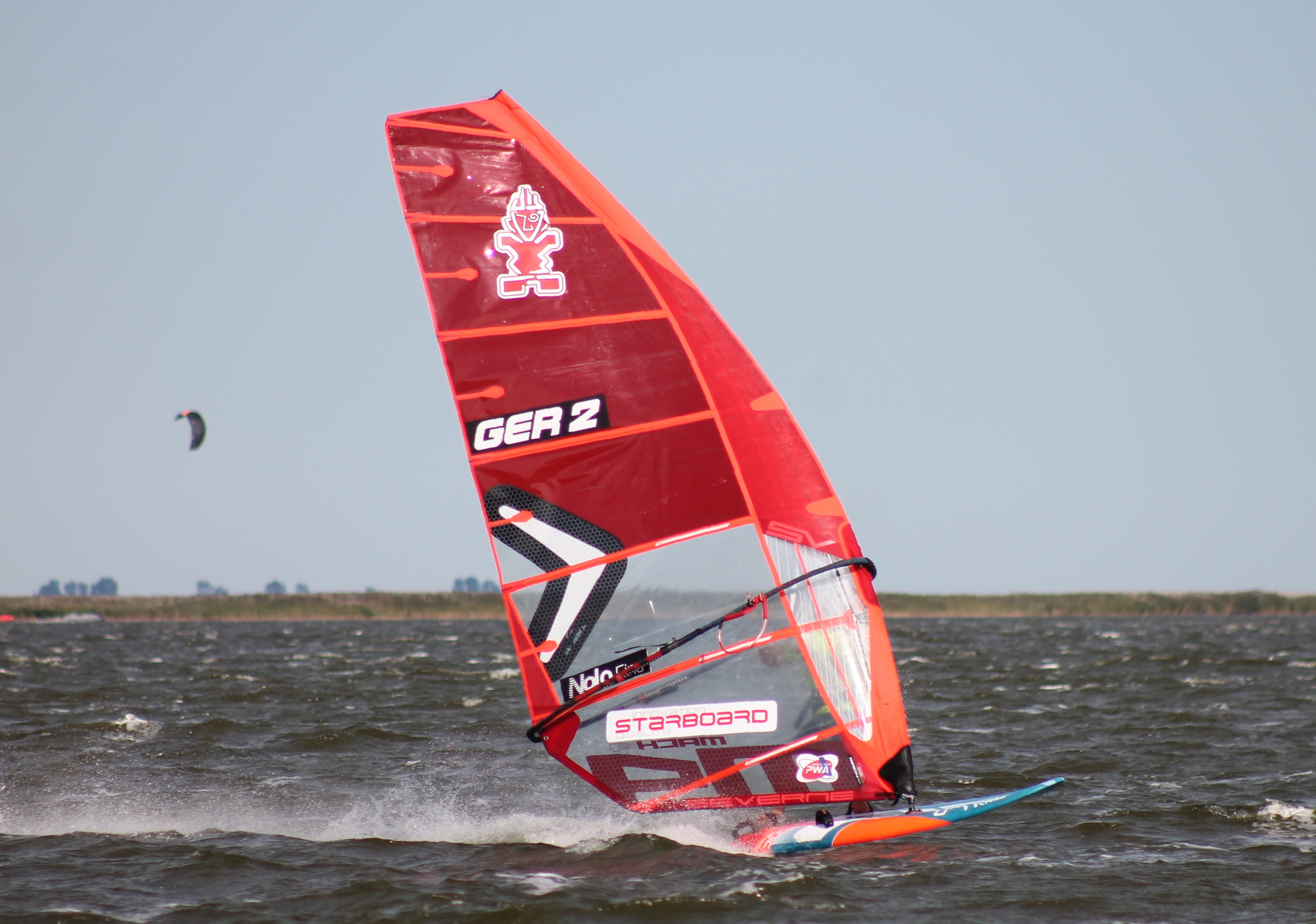 Leider spielte der Wind an diesem Tag jedoch nicht so mit wie erhofft. Zahlreiche Winddreher und sehr böige Bedingungen ließen schlussendlich kein offizielles Rennen zu. Da im Rahmen der IDM allerdings auch der „Große Preis der Kurverwaltung Born“ ausgetragen wurde, traf die Regattaleitung die Entscheidung auf einem verkürzten 250 m Kurs ein Rennen für diesen Sonderwertung zu starten. Damit wurde zugleich auch dem gesamten Feld die Möglichkeit gegeben sich mit den Bedingungen des Spots vertraut zu machen.