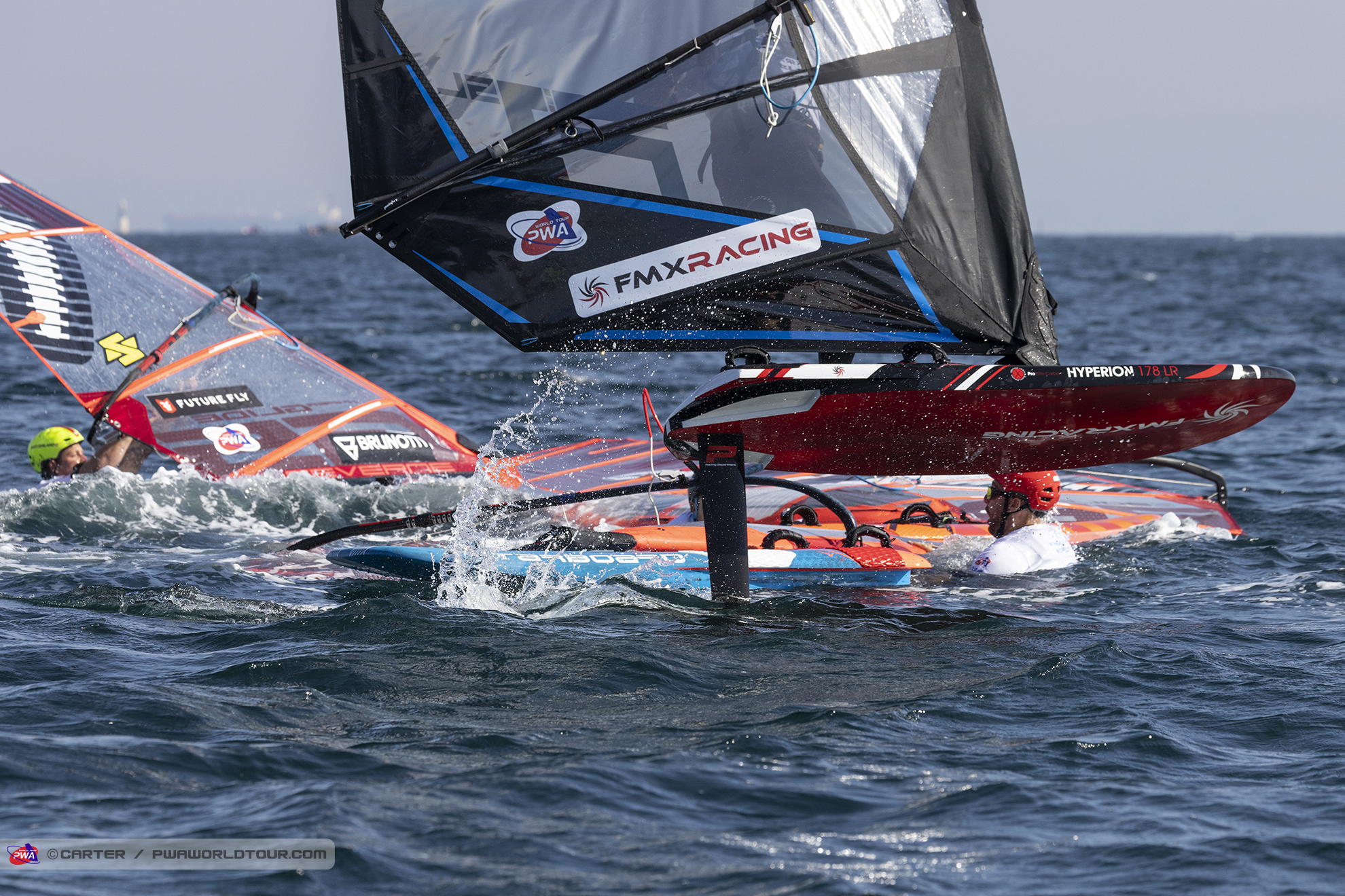 Das Foil hat seinen Wert am zweiten Tag des 2022 Fly! ANA Yokosuka, Miura Windsurf World Cup gezeigt, denn im Slalom der Damen wurde ein Ergebnis erzielt, während im Slalom der Herren nur noch das Winner- und das B-Finale gefahren werden müssen, um auch hier ein Ergebnis zu erzielen. In den Jahren vor der Einführung des Foilings wäre der heutige Tag im Grunde genommen ein Ruhetag gewesen, aber stattdessen konnten die weltbesten Teilnehmer einige unterhaltsame Rennen liefern, obwohl der heutige Tag selbst mit dem Aufkommen des Foilings genau an der Grenze lag, wenn es um konkurrenzfähige Winde ging (5-10 Knoten), was bedeutete, dass perfekte Halsen zwingend erforderlich waren, um erfolgreich zu sein, während die meisten Fehler hart bestraft wurden.