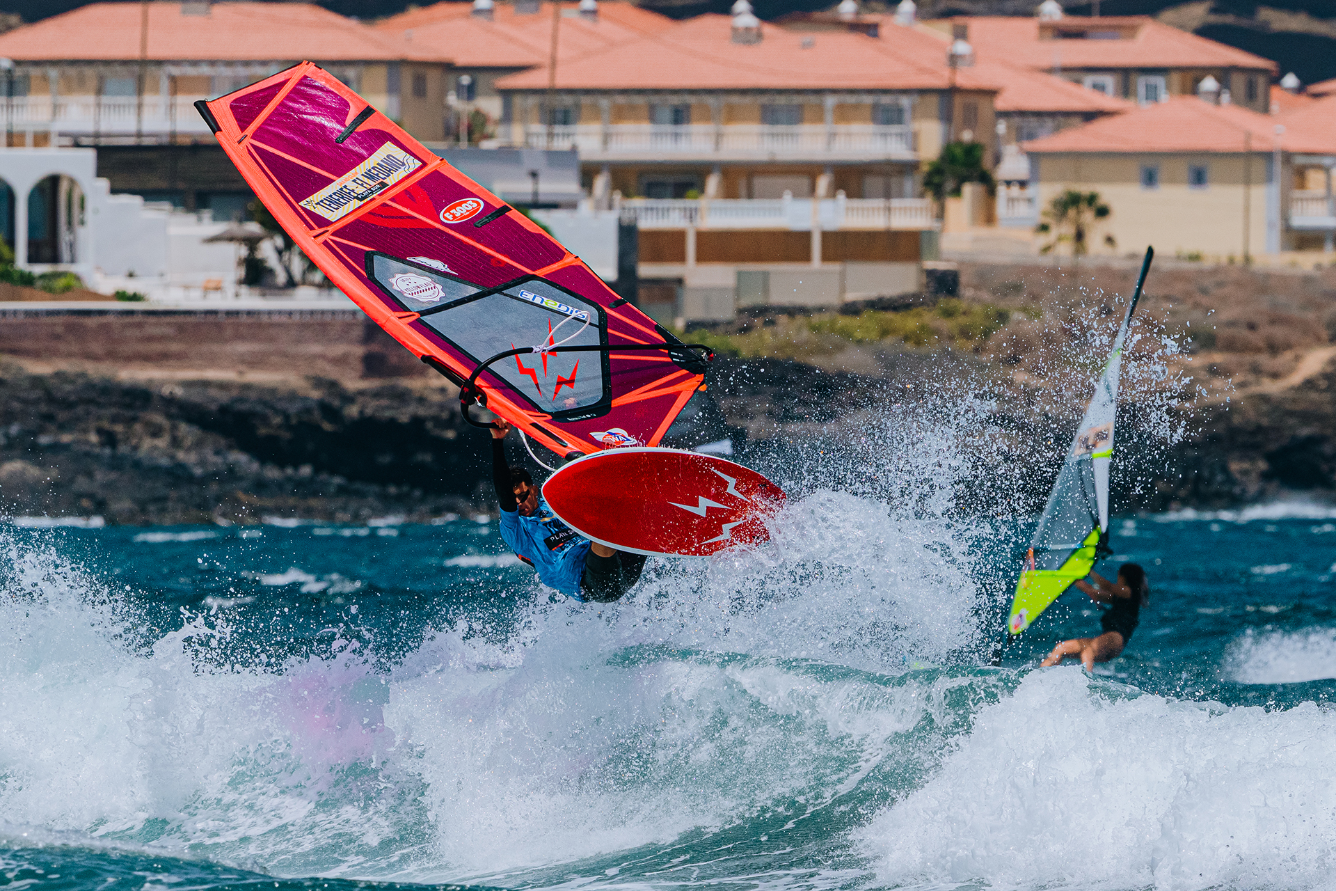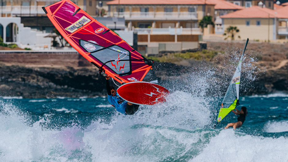 Nach einigen Tagen Slalom X trat am 5. Tag des 2025 Playa Surf CBbC Hotel Tenerife El Médano Windsurf Grand Slam die Wave-Fleet der Männer zum ersten Mal in dieser Woche in den Wettkampf ein, wodurch die erste Runde der Single Elimination unter relativ schwierigen Bedingungen abgeschlossen werden konnte. Dennoch gelang es den weltbesten Wave-Surfern, einige magische Momente zu produzieren, sodass nach 16 Minuten, in denen sie ihre beiden besten Wellen verbinden und ihren besten Sprung landen mussten, nur noch die 32 besten Männer übrig blieben.