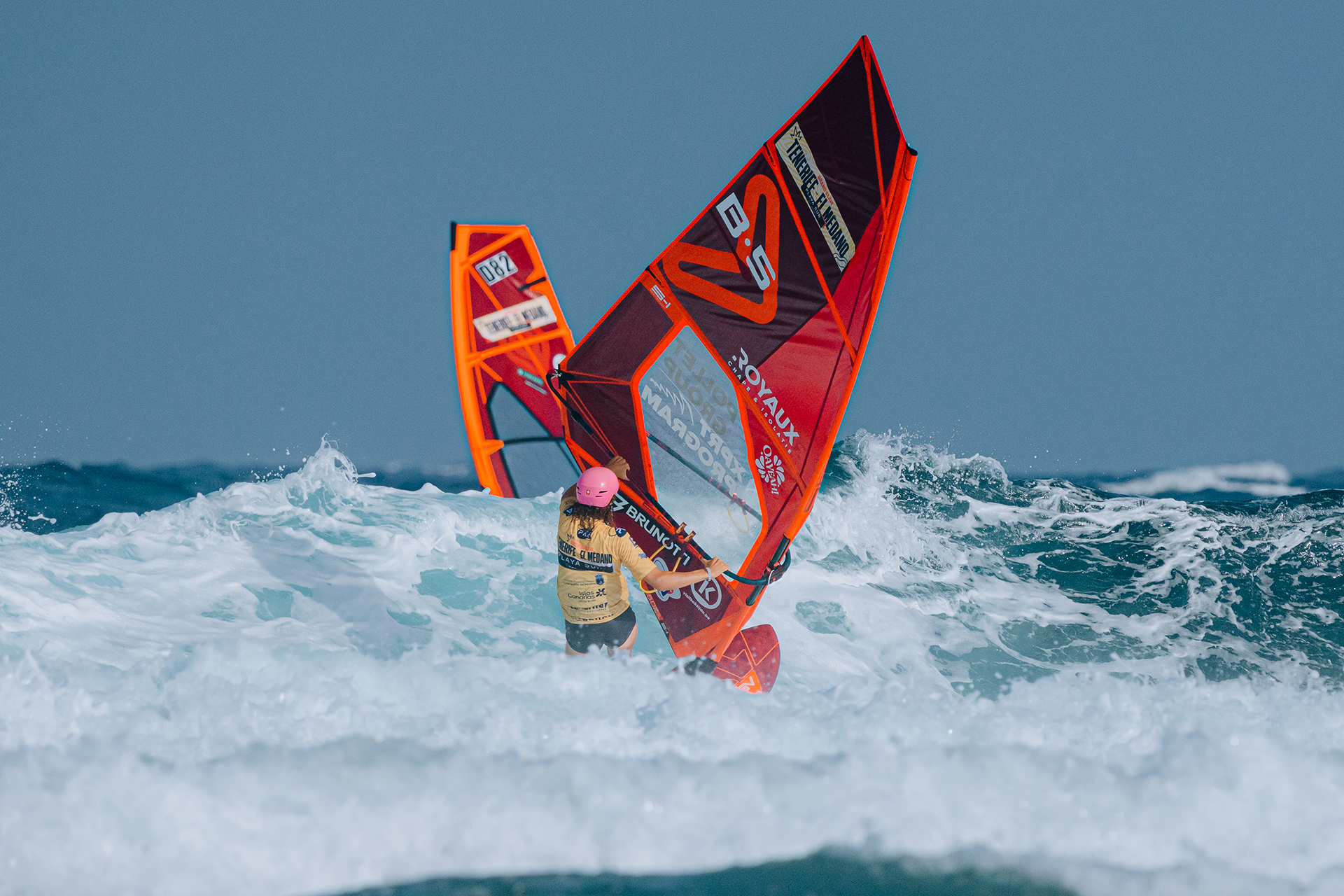 Sol Degrieck (Severne / Severne Sails) only finished ninth here in 2024, but today she booked her place in the final and is now guaranteed a top four finish after completing the podium. The 15-year-old took an aggressive approach to her wave riding, but sometimes possibly just tried to push a little too hard as she looked to land an aerial, but even so she’ll be delighted to have majorly bettered her previous result here.