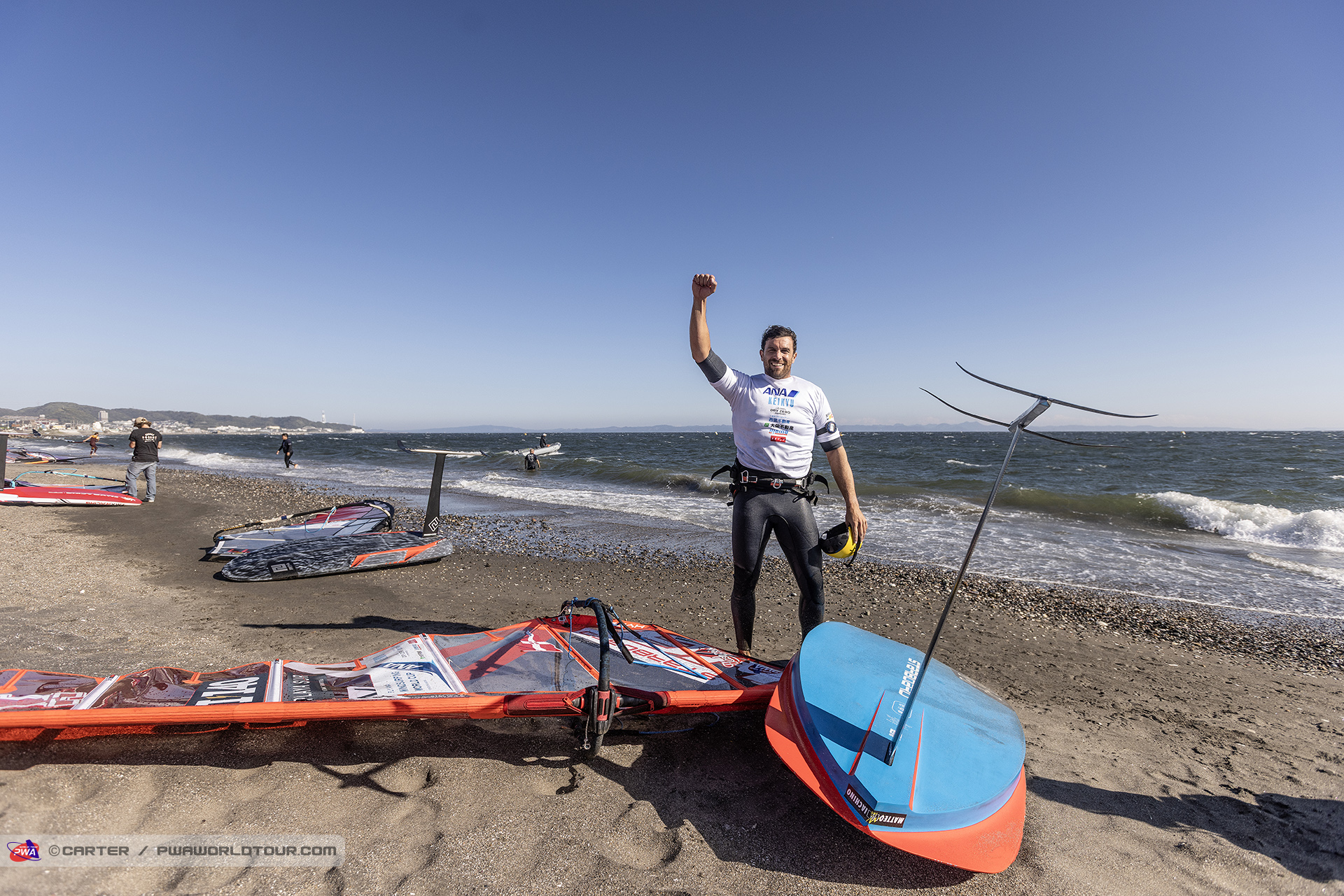 Matteo Iachino (Starboard / Severne Sails) came into the event knowing that a top five finish would guarantee him a third world title and the Italian never looked in danger of finishing outside the top three here after making a confident start to proceedings. In the end, Iachino finishes the last event of the year in second place after two second and two third places in the four eliminations completed as he produced a controlled display. Iachino looked cool, calm and collected in Japan and he now has his just rewards as he can now celebrate adding to his previous world titles from 2016 and 2023 after performing superbly all season.