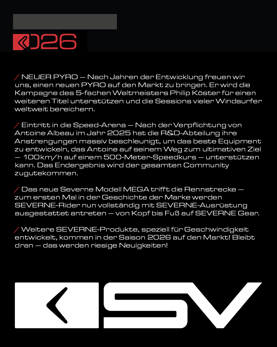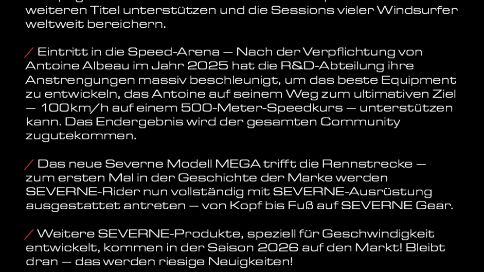 Das kommende Jahr steht bereits in den Startlöchern mit neuen Projekten, neuen Produkten und neuen Ambitionen. SEVERNE arbeitet an wegweisenden Entwicklungen, die Performance neu denken, und an Highlights, die ihr nicht verpassen wollt! :