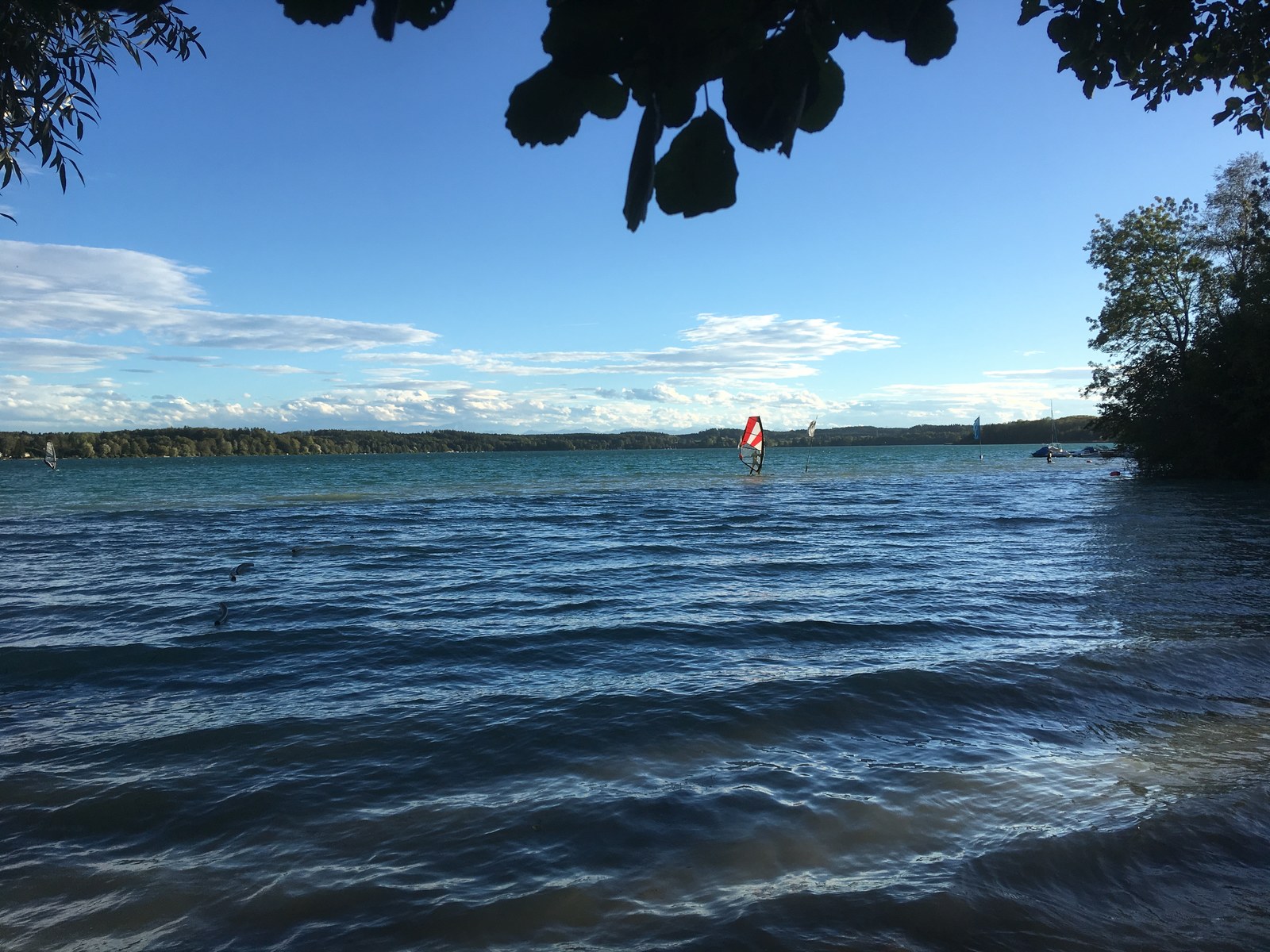 Heute bin ich etwas zu spät an den See gekommen. Zunächst dachte ich der Wind wäre schon abgeflaut, aber er zog nochmal ganz gut an. Kaum auf dem Wasser, kam auch noch die Sonne raus, schee wars - aber auch sauber böig.