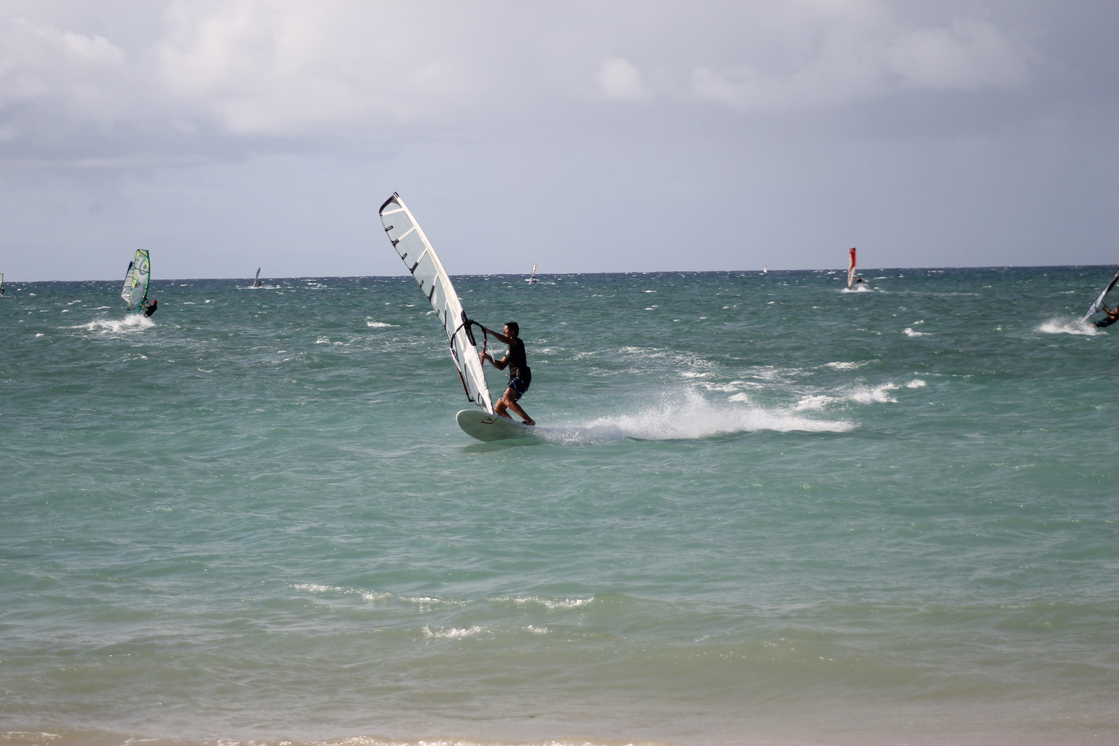 Matt hat mit geraten nach Kanaha zu gehen, ein öffentlicher Beachpark direkt hinter dem Flughafen, ein Traum! Parkplätze, riesige Wiesen zum aufbauen, Schatten, Duschen und Toiletten, Sandstrand, ich wüsste nicht was besser zu machen ist! Trotz der flachen Bedingungen, ca. 600m draußen ist ein Riff an dem auch "kleine Welle" bricht, sind fast ausschließlich Wavejungs, und die es werden wollen, am Start. Das Niveau ist lange nicht so hoch wie gedacht, ein paar Gute sind aber Immer am Start.