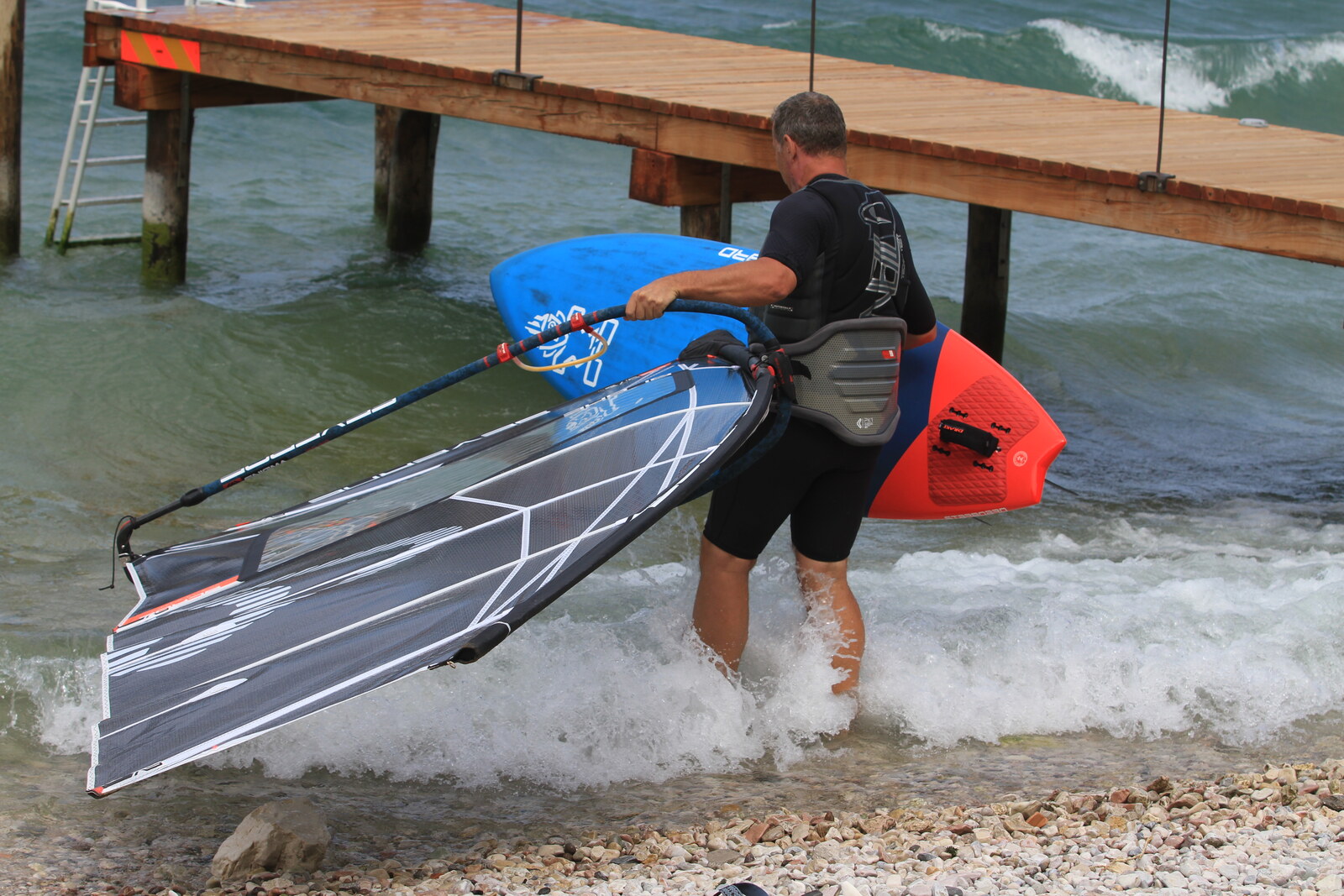 Nordwind wie es sein soll. Gleich zum Start ein bisschen mit der Segelgröße verschätzt, rund 100m vom Ufer entfernt war der Wind doch stärker als vermutet. Zurück, umgeriggt und dann hat es gepasst. Am späteren Vormittag kam noch ein heftiges Gewitter - ideal um etwas zu frühtücken - danach kam der Wind wieder zurück, etwas böig und drehend aber dafür mit viel Sonne.