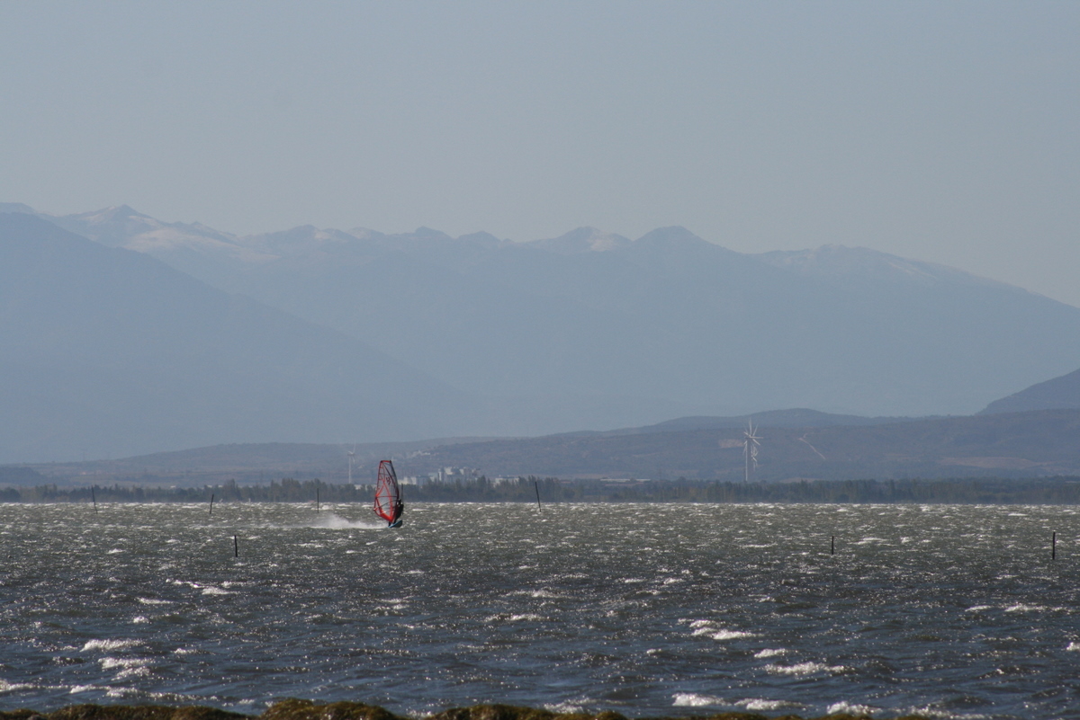Heute nun der Klassiker-Tramantan! Wind am Anschlag 7-8 Bft. mit ein paar 9ner Böen und dazu gab es strahlend blauen Himmel und den ganzen Tag Sonnenschein. Nach Slalommaterial stand mir bei den Bedingungen nicht der Sinn. Ich habe mich mit Petra und Otmar für Starkwind-Wavematerial entschieden, was an Hand der erreichten Geschwindigkeiten von ca.55 kmh unter den Bedingungen nicht schlecht war. ;o)))! Wenn der Urlaub so bleibt- ist alles Granate.