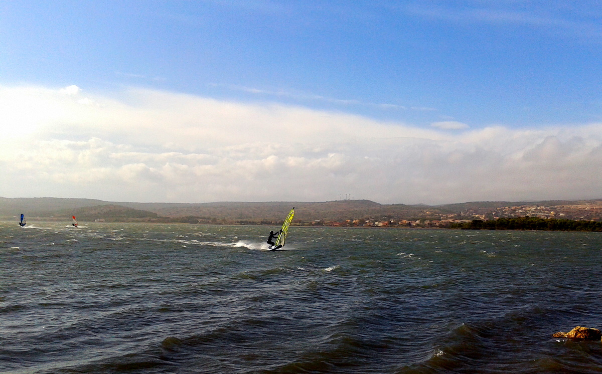 Wieder ein sehr schöner Tag in La Mine bei Marin. Sommerliche Temperaturen um 20-22°C und warmer Wind mit 8-9 Bft aus Südost machen Urlaubentspannung nicht schwer. Zum Anfang waren Otmar und ich mit 3 Anderen die Einzigen auf dem Wasser. Gegen Mittag kamen aber noch einige gute Locals dazu. Zum Schluss wäre auch das 3.6er gegangen, denn der Wind hatte dann in Böen 10 Bft.