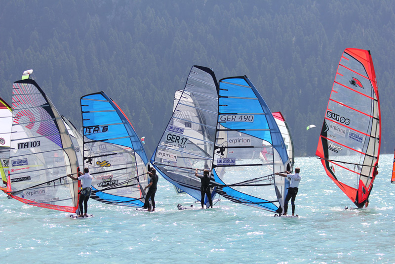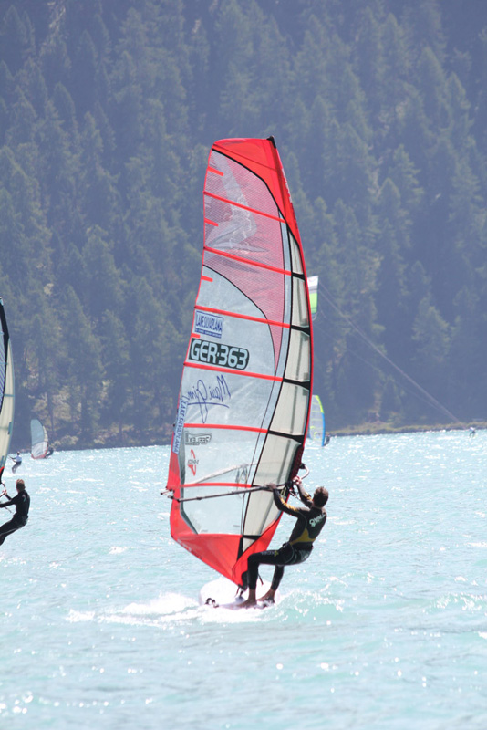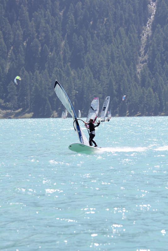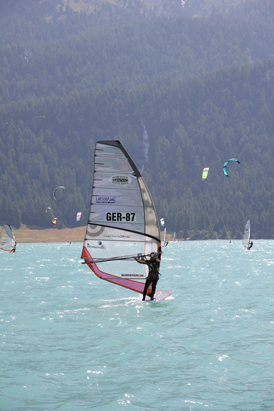 Morgens schon ohne Thermik ordentlich Süd-West Strömung das ab 9.00 die ersten Schaumkronen auf dem See waren. Der teilweise vorhergesagte Monstertag würde es nicht, aber Nachmittags wurden bis zu 30knt an der Luvtonne gemessen.