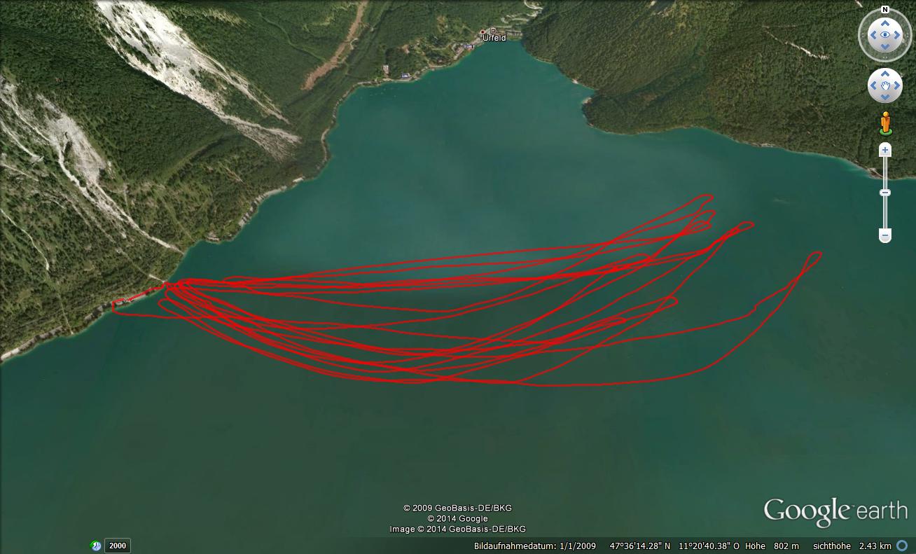 Nachdem am Kochelsee nichts mehr ging, hoch zum Walchensee. Dort angekommen sofort aufgebaut und gleich aufs Wasser. War super, der Wind kam direkt an die Galerie, kein schwimmen, kein dümpeln. Eine gute Stunde nur zu zweit auf dem Wasser - perfekt!