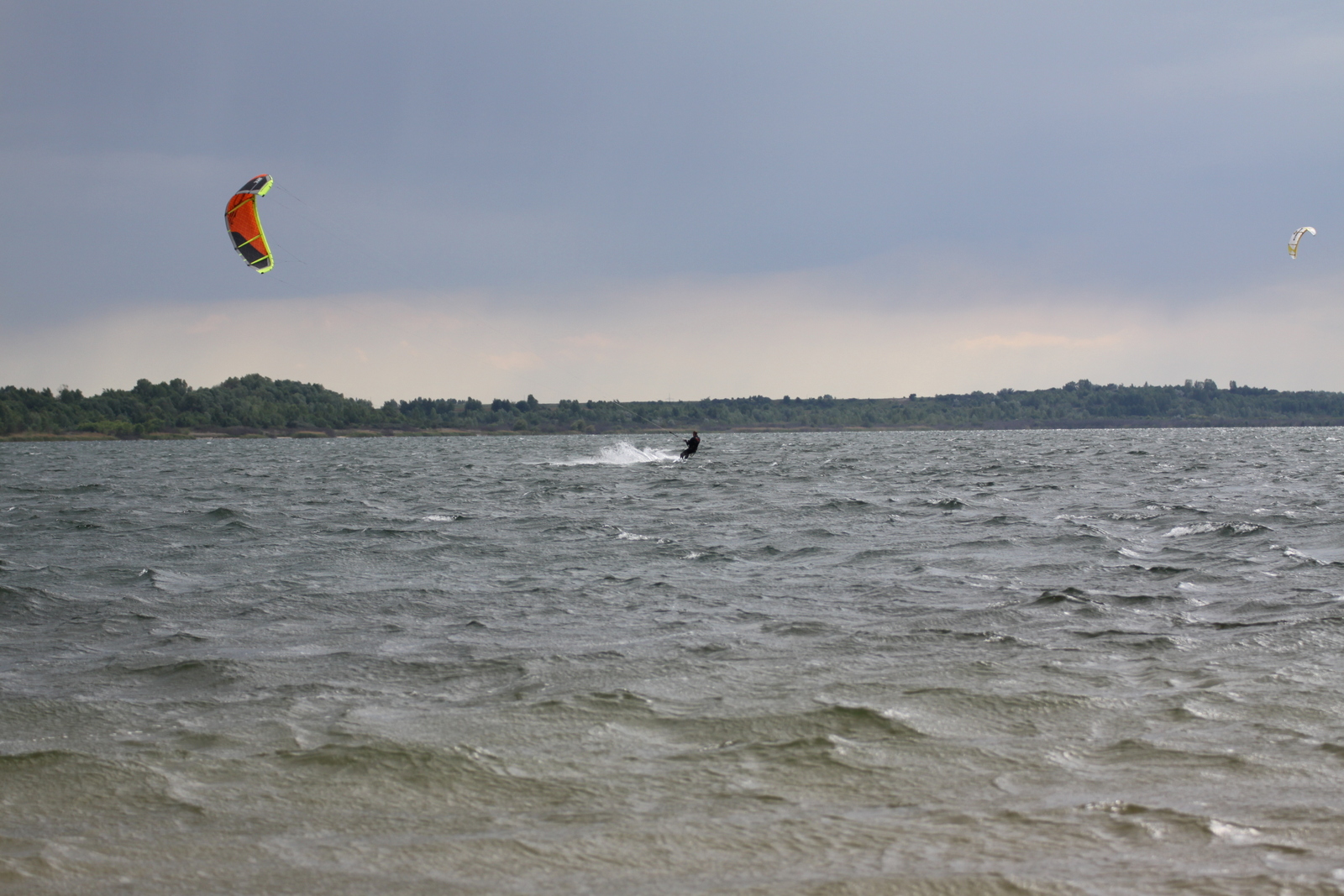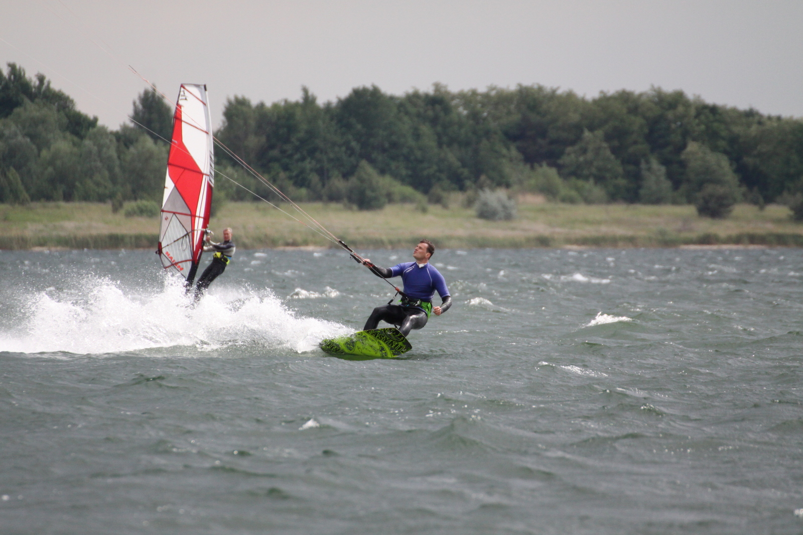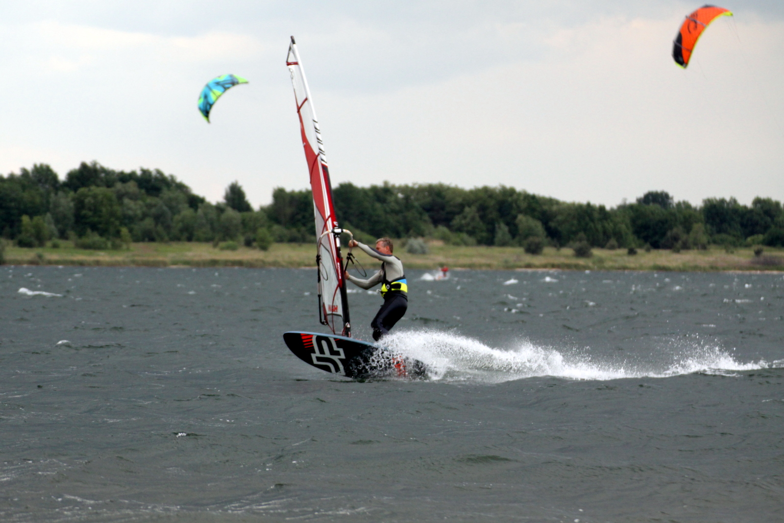 Sonne, Wolken, Regen... High Pressure in Mitteldeutschland. 5-6 Bft. belüfteten die Leipziger Tieflandsbucht ordentlich, so daß ich reichlich Druck in meiner Kombi hatte... 7.5 wäre auch gegangen, aber ich wollte keine Zeit mit Umriggen verschwenden...drei Stunden Volgasslalom! :o) Jörg war mit 6.2 gut angeblasen... wir hatten den See mit den Kitern für uns.