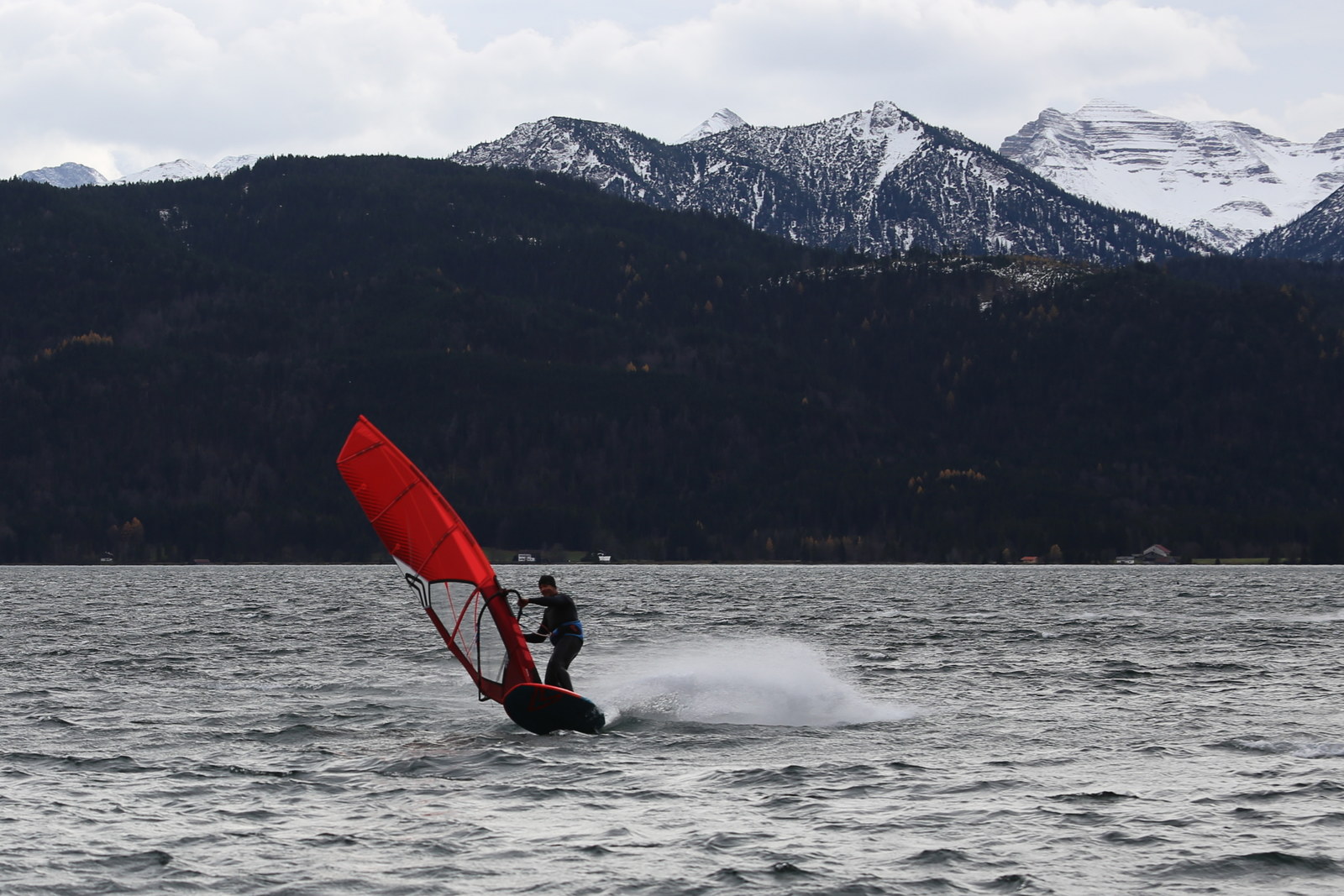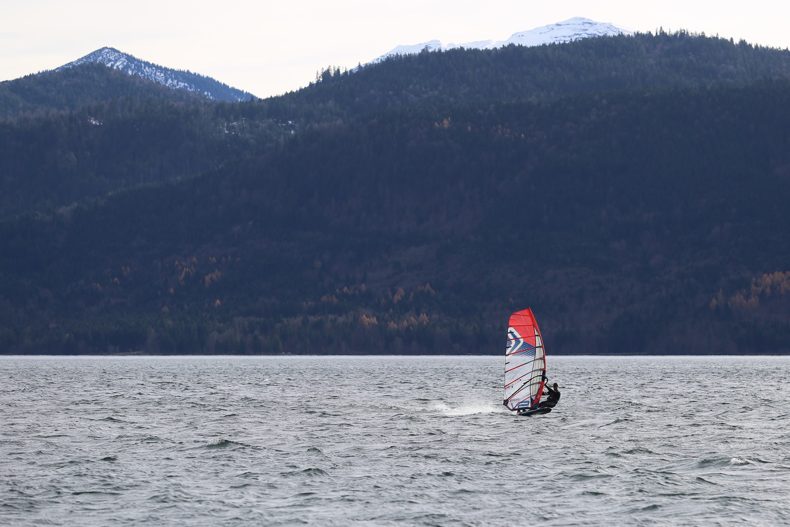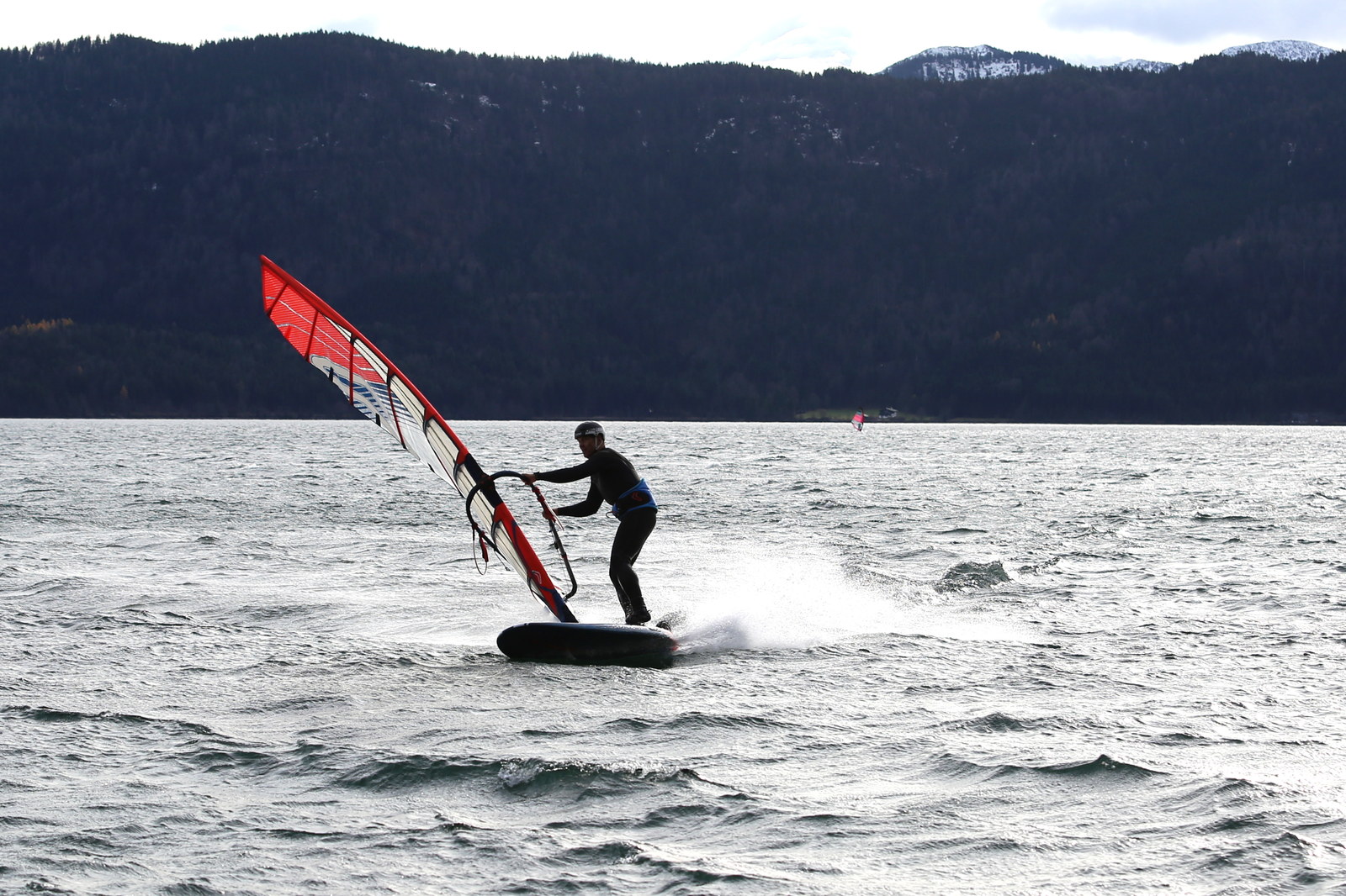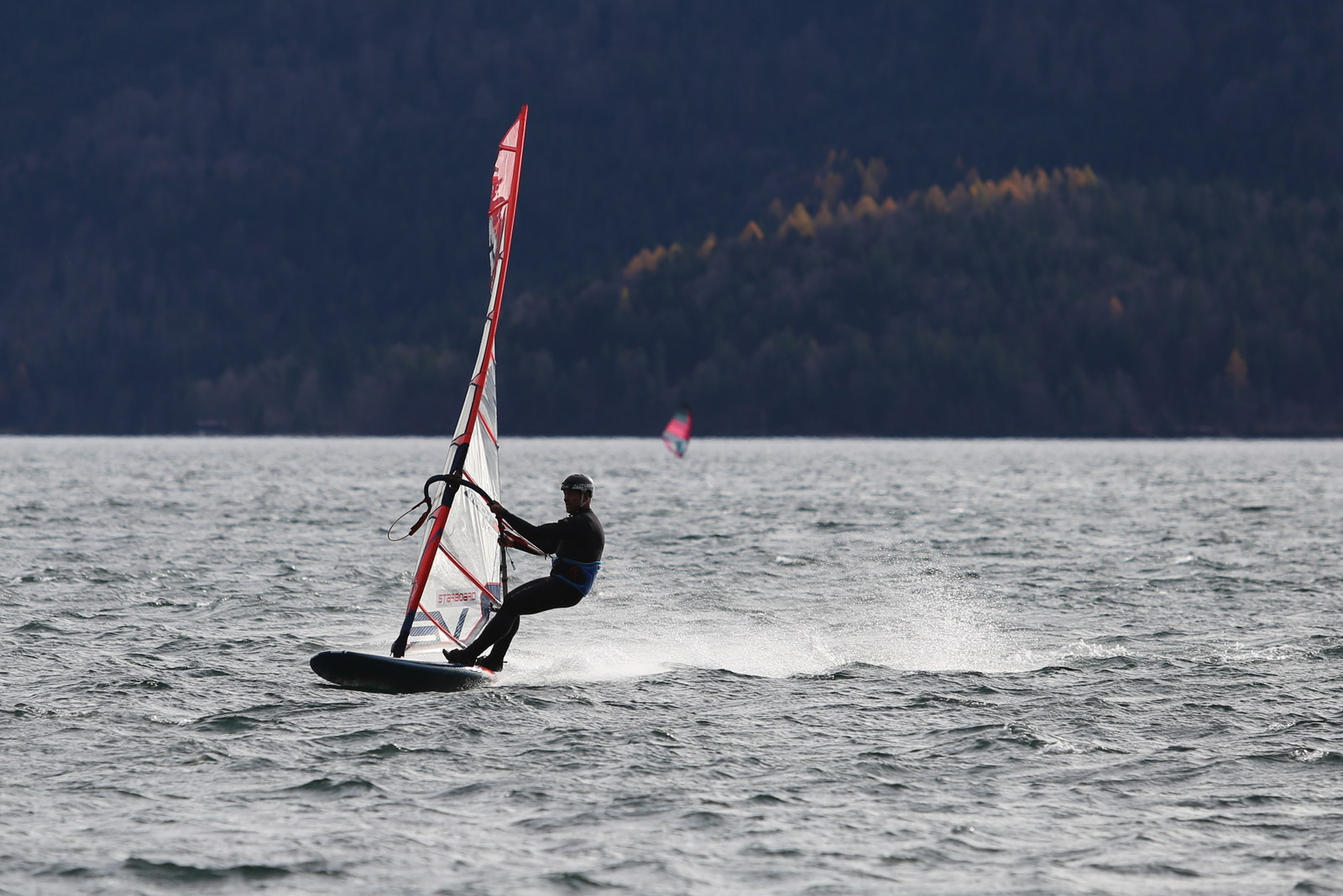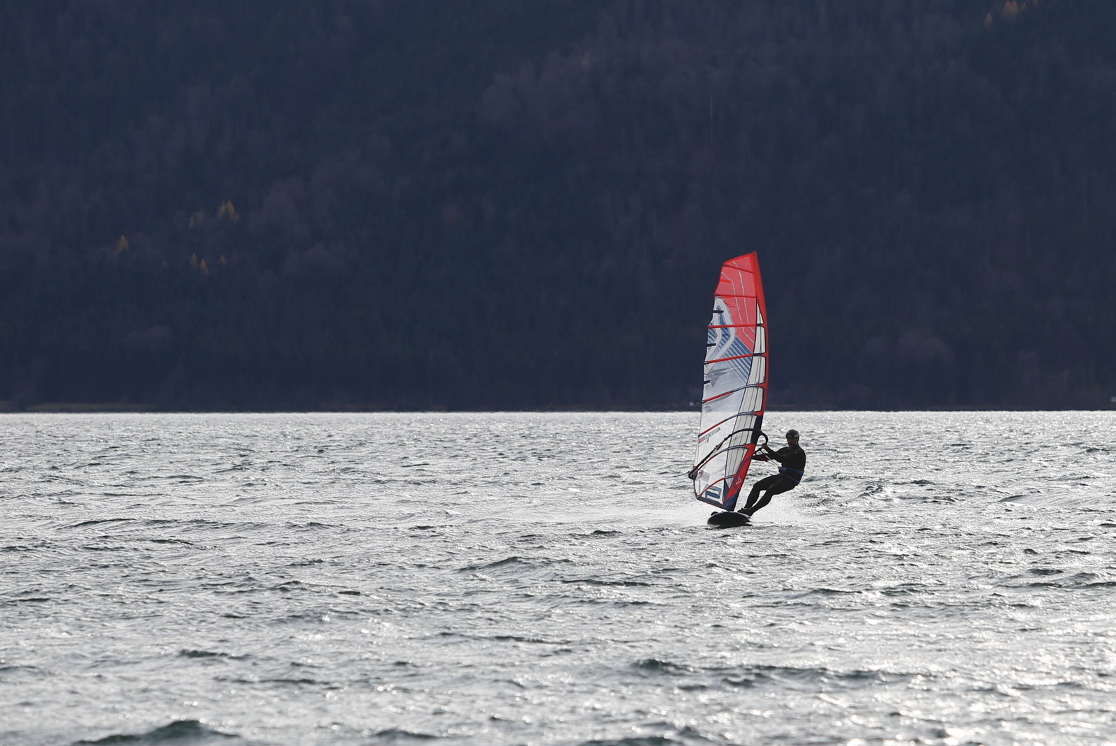 Föhn! Ein herrlicher Tag, ab dem späten Vormittag zog der Föhn sehr gut an und machte aus einem kalten Novembertag einen 16 Grad warmen Herbsttag. Schöne Bedingungen, zunächst mit dem mittleren Slalomzeug, später noch eine knappe Stunde etwas relaxter mit dem Waveboard.