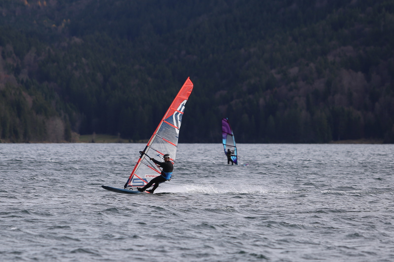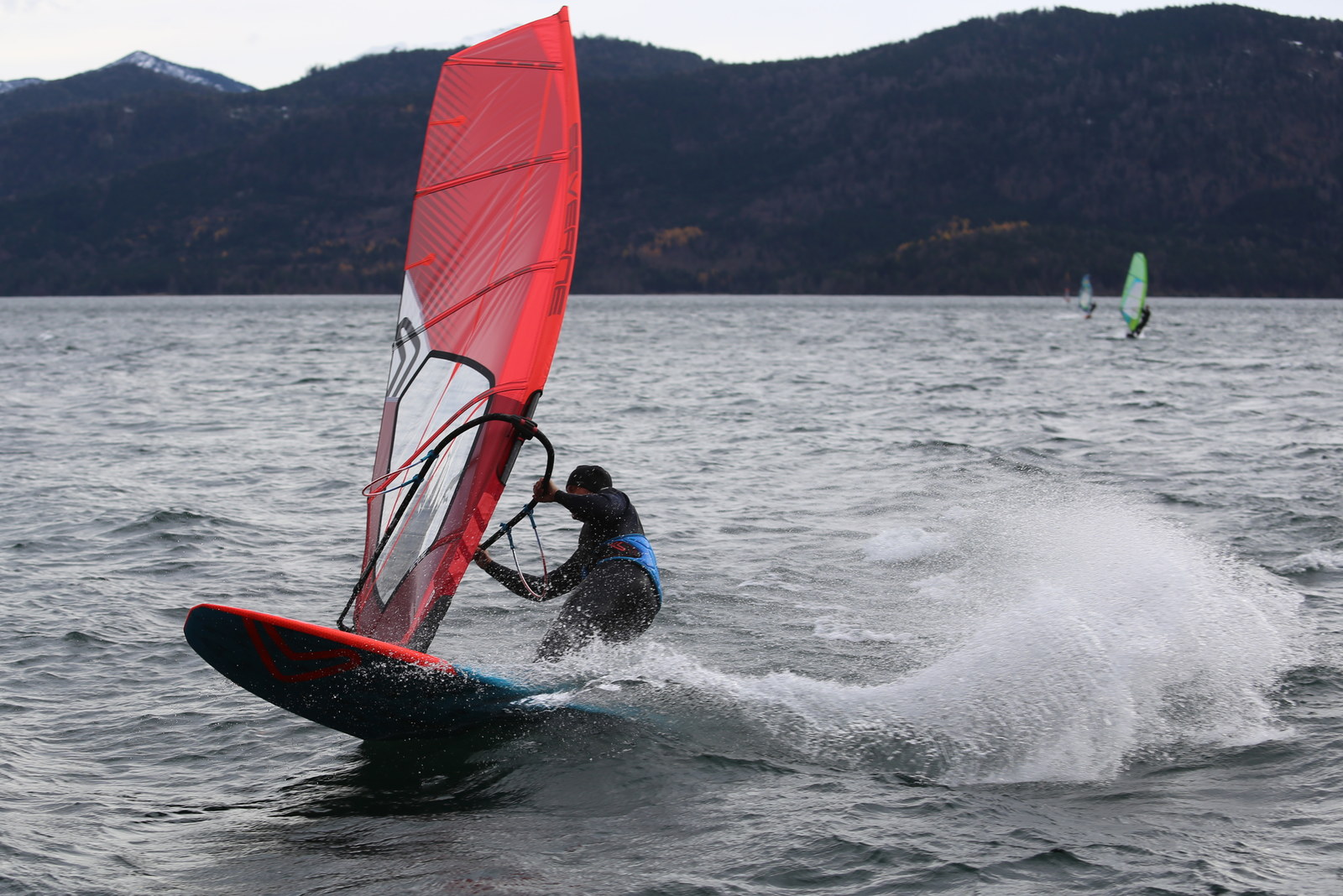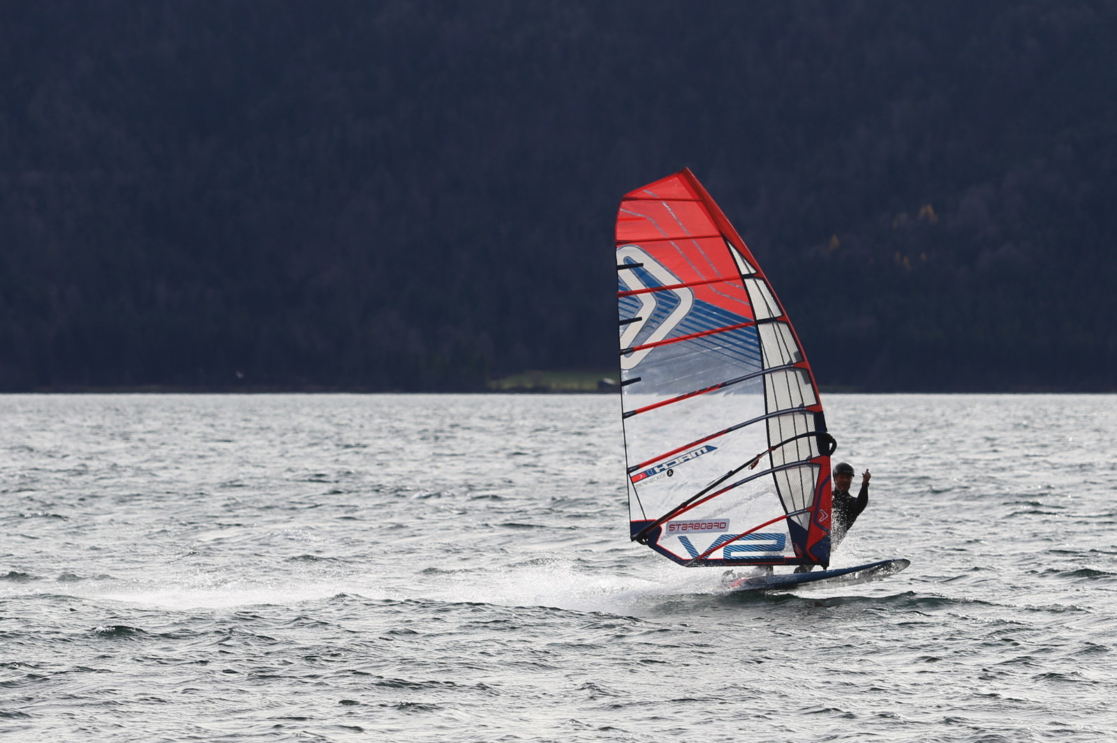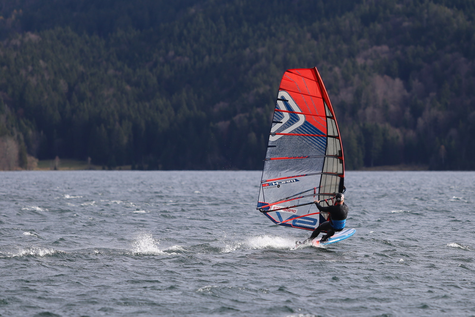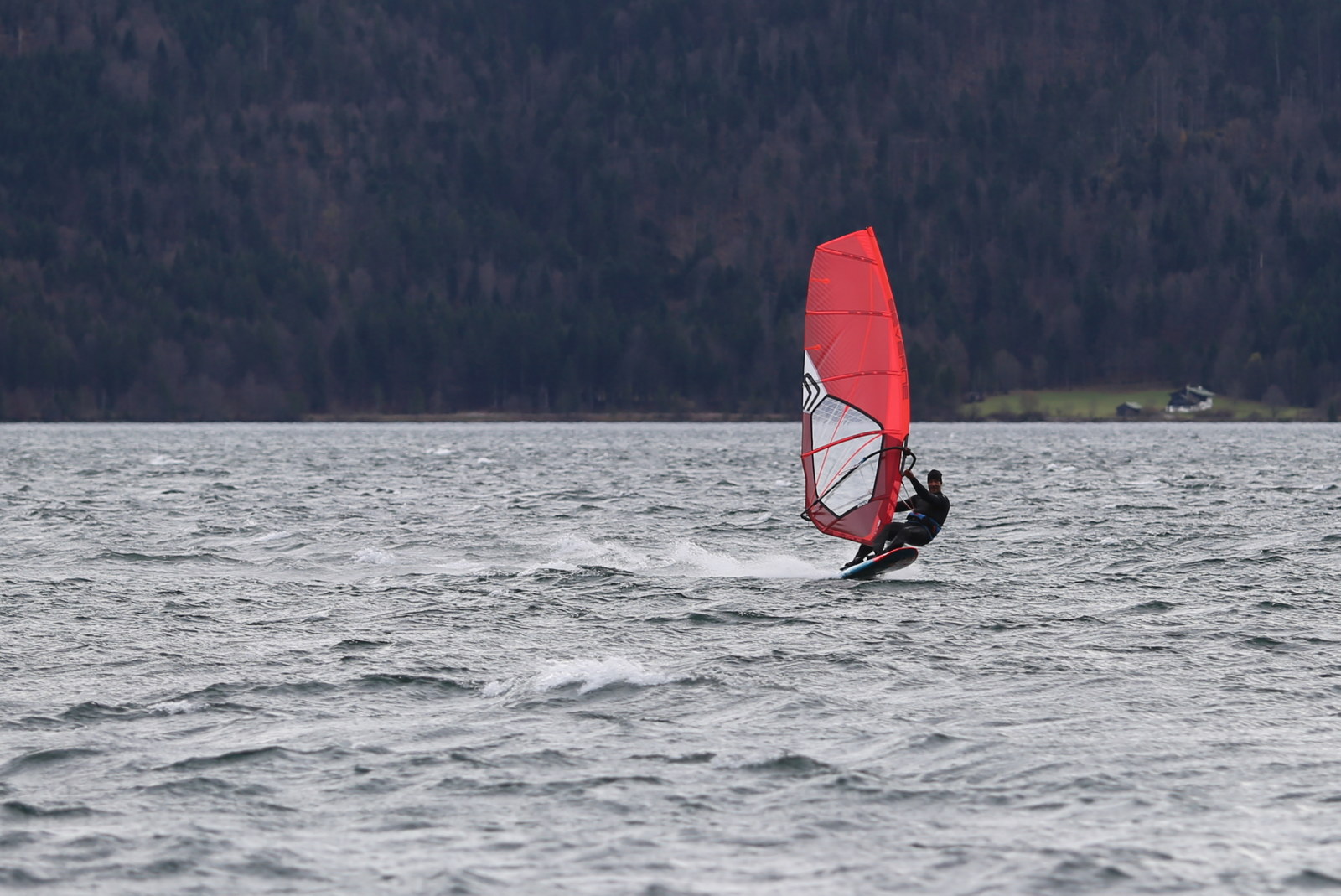 Föhn! Ein herrlicher Tag, ab dem späten Vormittag zog der Föhn sehr gut an und machte aus einem kalten Novembertag einen 16 Grad warmen Herbsttag. Schöne Bedingungen, zunächst mit dem mittleren Slalomzeug, später noch eine knappe Stunde etwas relaxter mit dem Waveboard.
